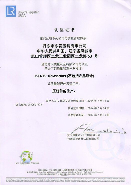 ISO/TS 16949:2009 認(rèn)證證書